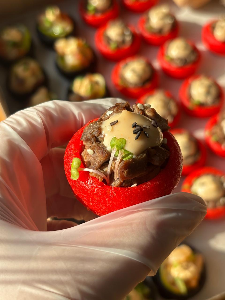 Креветки катаифи 12 шт Профитроли черные с лососевым рулетом и икрой 12шт Тарталетки с лаймовым мусом и икрой палтуса 6шт Тарталетки с креветками лососевым риетом и черри 6 шт